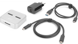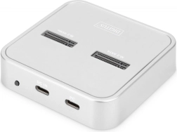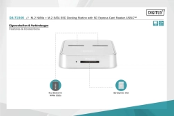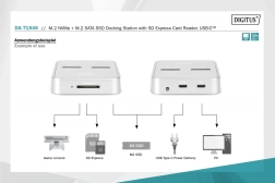 Univerzálna dokovacia stanica DIGITUS kombinuje dva nezávislé sloty pre SSD M.2 – jeden pre NVMe (B+M Key / M‑Key) a druhý pre SATA (B+M Key) – a k tomu čítačku SD Express 7.1. Získate tak flexibilné centrum pre správu a migráciu dát s podporou diskov až do 4 TB na slot a SD kariet až do 2 TB.
