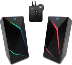 Reproduktory sú vybavené variabilným LED RGB podsvietením, ktoré reaguje na rytmus hudby alebo je možné nastaviť trvalé aj menivé farebné efekty. Pre posilnenie zvukových a vizuálnych zážitkov je k dispozícii ovládací modul pre riadenie hlasitosti a režimov pripojenia.