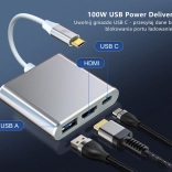 Adaptér USB C HUB 3v1 - HDMI, USB, PD strieborný
