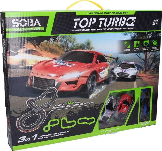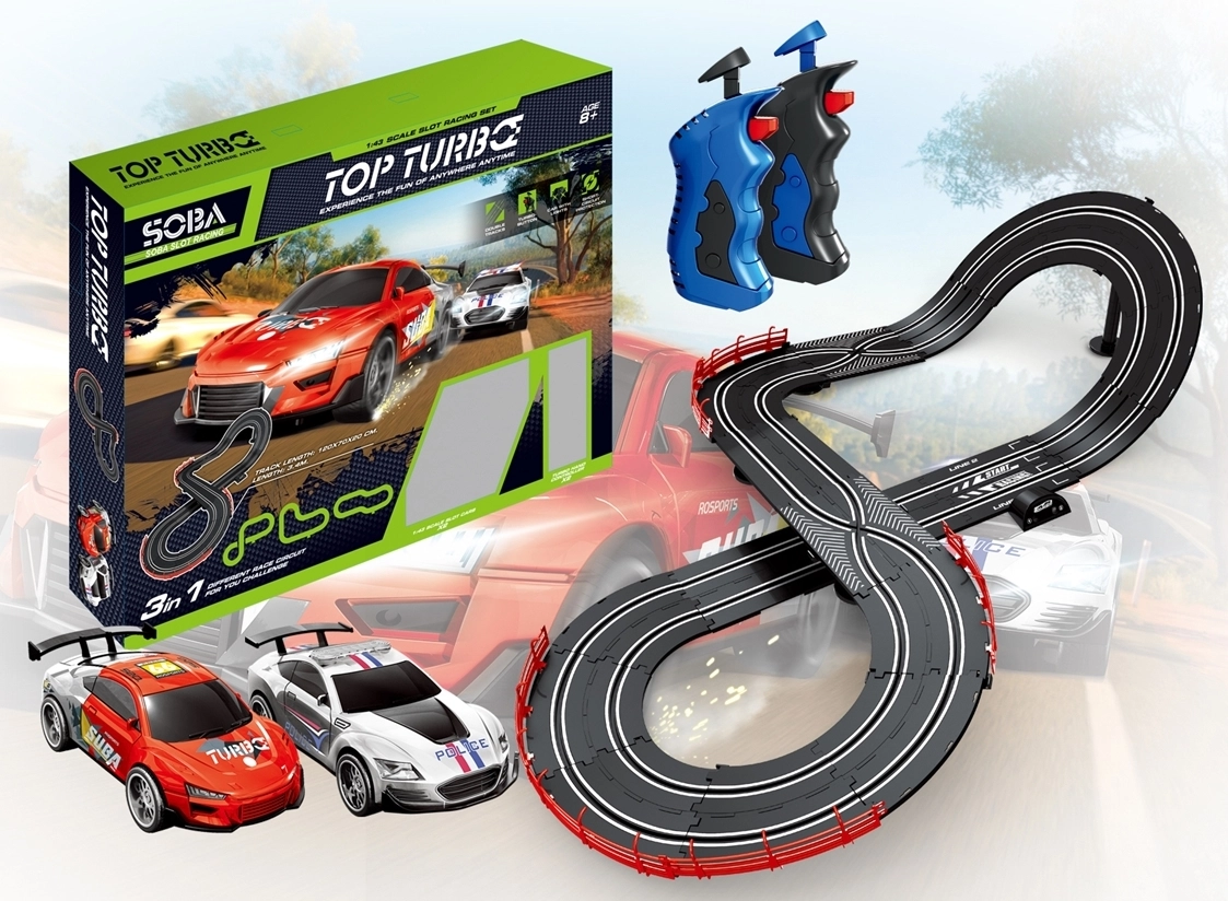 Trať možno zostaviť na 3 rôzne spôsoby, takže si zábavu ľahko prispôsobíte. Napájanie pomocou 12V adaptéra poskytuje stály výkon bez nutnosti batérií. Skvelé ako darček a perfektné pre rodinné pretekanie.