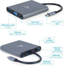- 6 v 1: HDMI 4K, VGA FHD, USB 3.0, audio 3,5 mm, SD a microSD, USB‑C PD