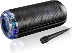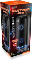 Bluetooth reproduktor Partybox UNI BT ponúka výkonný zvukový zážitok vďaka dvom vstavaným reproduktorom s celkovým výkonom RMS 30W a PMPO 750W. Disponuje robustným púzdrom a vstavanou batériou, ktorá vydrží až 6 hodín na jedno nabitie, čo z neho robí ideálneho spoločníka na vonkajšie oslavy.