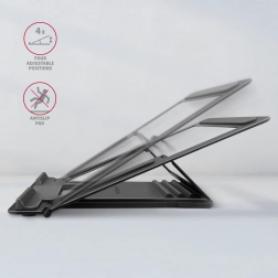 Stojan ponúka štyri nastaviteľné pozície pre ideálnu ergonómiu, čím znižuje únavu a bolesti pri dlhodobej práci. Kompaktný dizajn umožňuje jednoduché skladanie a prenášanie v dodávanom obale – perfektné pre cestovanie.