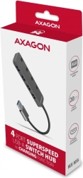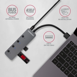 Kovový rozbočovač AXAGON HUE-MSA USB 3.2 Gen 1 (USB 3.0) umožňuje pripojiť až štyri zariadenia USB k notebooku alebo počítaču. Ponúka tiež deaktiváciu portov USB a funkciu nabíjacieho rozbočovača.