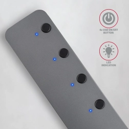 Každý port USB možno vypnúť/zapnúť stlačením tlačidla. Vďaka tomu možno jednoducho odpojiť nepotrebné zariadenia bez nutnosti ich fyzického odpojovania z USB rozbočovača. Každý port USB-A je vybavený modrou LED diódou, ktorá indikuje, či je port zapnutý alebo vypnutý. Keď je rozbočovač pripojený, svietia všetky LED diódy = porty sú zapnuté, LED nesvieti = port je vypnutý.