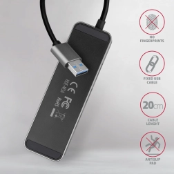Kovové puzdro rozbočovača je vyrobené z hliníka a poskytuje vynikajúcu mechanickú ochranu pri častom prenášaní. Elegantný povrch puzdra s jemnou textúrou chráni pred zvyškami odtlačkov prstov. Gumené podložky zabraňujú kĺzaniu po stole. 20 cm dlhý pevný kábel USB je ideálny pre používateľov mobilných zariadení.