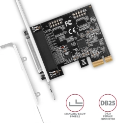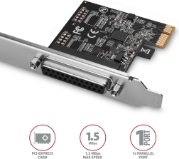 Táto PCI-Express karta pridá do vášho PC spoľahlivý paralelný port na pripojenie tlačiarní, plotrov, programátorov EPROM, hardvérových kľúčov a ďalšieho priemyselného príslušenstva. O bezproblémovú kompatibilitu sa stará overený čipset ASIX AX99100, ktorý podporuje režimy SPP/BYTE/ECP a prenosovú rýchlosť až 1,5 MB/s.