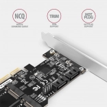 Vďaka rozhraniu PCI‑Express 3.0 x2 získate dostatočnú dátovú priepustnosť až 4 GB/s pre plynulý prenos dát. Karta podporuje Hot‑Plug, NCQ, TRIM aj Port Multiplier (Command Based Switching) a umožňuje bootovanie z pripojených diskov (BIOS/UEFI). Štyri LED indikátory aktivity a header pre pripojenie LED diód skrine uľahčia kontrolu prevádzky.