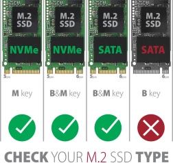 Bezskrutková konštrukcia z čierneho hliníka s ventiláciou zabezpečuje optimálne chladenie a predlžuje životnosť disku. Vhodná je pre všetky veľkosti diskov SSD M.2: 2242, 2260 a 2280 mm. Tento produkt je skvelou voľbou pre tých, ktorí hľadajú štýlové a efektívne riešenie pre ukladanie a prenos dát.