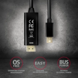 Aktívny kábel AXAGON Mini DisplayPort → HDMI kombinuje prevodník aj prepojovací kábel do jedného riešenia. Stačí zapojiť a okamžite prenášať obraz aj zvuk do HDMI zariadení. Podporuje rozlíšenie až 4096 × 2160 pri 30 Hz, čo zaručuje ostrý obraz a plynulé prezentácie či video vo 4K.