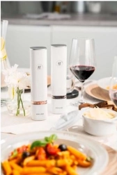 Štýlový a výkonný elektrický mlynček na korenie, ktorý spoľahlivo pomelie soľ, korenie aj ďalšie koreniny. Vďaka keramickému mechanizmu a plynulému nastavovaniu hrubosti vždy dosiahnete ideálnu chuť. LED osvetlenie nasvieti dochucované jedlo a nabíjateľná Li‑ion batéria s výkonným motorom zabezpečí dlhú výdrž. Priehľadové okienko uľahčí kontrolu zásoby.