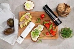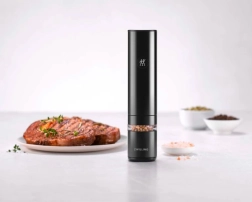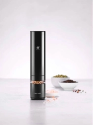 Elegantný elektrický mlynček na korenie ZWILLING ENFINIGY v čiernom prevedení prináša rýchle a rovnomerné mletie soli, korenia aj koreniacich zmesí. O precízne výsledky sa starajú keramické mlecie kamene s dlhou životnosťou, plynulé nastavenie hrubosti, výkonný motor a dobíjací Li‑Ion akumulátor. Praktické LED osvetlenie a priehľadné okienko uľahčia dochucovanie aj kontrolu zásob.