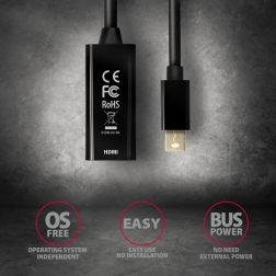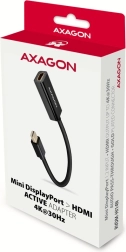 Aktívny mini DisplayPort → HDMI adaptér AXAGON RVDM-HI14N je spoľahlivé riešenie na pripojenie HDMI displejov k počítačom s mini DisplayPortom. Zaistí kvalitný prenos videa až do 4K/30 Hz a zároveň prenáša aj digitálne audio. Vďaka kompaktným rozmerom sa hodí aj do stiesnených priestorov a nepotrebuje žiadne externé napájanie.