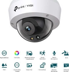 Profesionálna dome IP kamera VIGI C240 s rozlíšením 4MP prináša plnofarebný obraz 24/7, pokročilú AI detekciu osôb a vozidiel, vstavaný mikrofón a odolnosť IK10 a IP67. Podporuje H.265+, napájanie PoE/12 V DC, lokálne záznamy na microSD (až 256 GB) a flexibilnú správu cez web, NVR a aplikáciu VIGI.