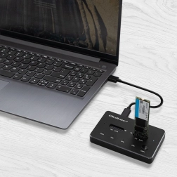 Vďaka rozhraniu USB 3.1 Gen 1 s protokolom UASP dosahuje rýchly prenos až 6 Gb/s a umožní plynulú prácu aj s veľkými súbormi. Pre maximálne pohodlie nechýba offline klonovanie bez počítača – stlačením tlačidla COPY spustíte kopírovanie z disku A na disk B, pričom LED kontrolky (25/50/75/100 %) jasne ukazujú priebeh. Inštalácia je bez ovládačov, stačí zapojiť a používať Plug & Play.