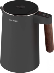 Rýchlovarná kanvica Concept RK3305 si nájde miesto v každej domácnosti. Jej atraktívny dizajn podčiarkuje matný tmavosivý plášť usadený na minimalistickom podstavci, doplnený elegantnou rukoväťou z imitácie dreva. S objemom 1,5 litra pohodlne pripravíte až 6 šálok obľúbeného horúceho nápoja.