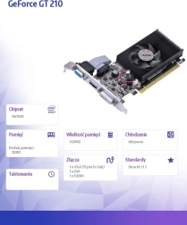 Táto grafická karta je vybavená 512 MB DDR3 pamäte a čipom NVIDIA GeForce 210, čo zaisťuje stabilný výkon na každodenné použitie. S rozhraním PCI Express 2.0 a tromi výstupmi (VGA, DVI a HDMI) umožňuje jednoduché pripojenie k rôznym typom monitorov a televízorov.