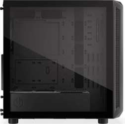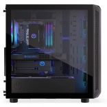 Skriňa ponúka moderný dizajn s priehľadným bočným panelom zo skla a svetla ARGB, ktoré pridávajú estetickú hodnotu.