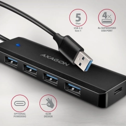 Praktický cestovný hub AXAGON HUE‑C1A okamžite pridá štyri plnohodnotné porty USB‑A s priepustnosťou až 5 Gb/s pre bleskový prenos dát. Pevne uchytený 19 cm kábel uľahčí pripojenie k notebookom aj stolovým PC, kompaktné telo s hmotnosťou len 37 g sa zmestí do každej tašky.