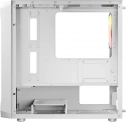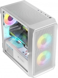 Skrinka je pripravená na výkon: pojme GPU až 340 mm, chladič procesora do 155 mm a podporuje aj vodné chladenie. Vďaka prachovým filtrom v spodnej časti pod zdrojom, hore a mesh čelu zostáva zostava čistejšia a tichšia. Horný I/O panel ponúkne USB 3.0, dvojicu USB 2.0, kombinovaný audio konektor 3,5 mm, tlačidlo Power a tlačidlo na ovládanie ARGB podsvietenia.