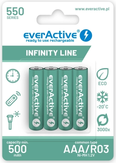 Sada 4 akumulátorov AAA R03 s kapacitou 550 mAh v technológii ready to use na okamžité použitie. Rada Infinity Line je ideálna pre solárne lampy, bezdrôtové telefóny a ďalšie zariadenia s nízkou až strednou spotrebou, kde skvelo nahrádzajú jednorazové batérie a prinášajú ekonomickú aj ekologickú úsporu.
