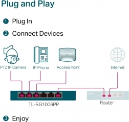 TP-Link SG1006PP je ideálne riešenie pre prepojenie a napájanie rôznych zariadení v sieti vďaka 6 portom RJ45 s rýchlosťou 10/100/1000 Mb/s, z toho 1 port je PoE++ a 3 porty PoE+. Prepínač spĺňa štandardy IEEE 802.3af/at/bt a ponúka množstvo funkcií pre optimalizáciu pripojenia: