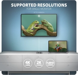 - 1x HDMI (A, female); až 4K 4096×2160@60 Hz; 2560×1440 až 120 Hz; 1920×1080 až 240 Hz; vyžaduje USB‑C s DisplayPort Alt Mode 1.4+ alebo Thunderbolt 3/4; HDR (10 bit), Hot Plug Detect, TMDS, HDCP 1.4/2.3; 2‑kanálový zvuk až 24 bit/192 kHz (podľa zdroja a koncového zariadenia)