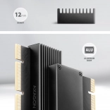 Súčasťou je robustný rebrovaný hliníkový chladič, ktorý spolu s teplovodivými podložkami efektívne odvádza teplo z oboch strán modulu. Tým zabezpečuje stabilný výkon aj u náročných diskov PCIe 5.0 NVMe bez throttlingu. Adaptér zvláda jednostranné aj obojstranné moduly a nemá limit maximálnej kapacity.