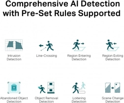- Klasifikácia ľudí a vozidiel, inteligentná detekcia (línia, oblasť), analýza a rýchle vyhľadávanie