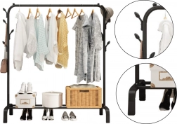 Udržte si doma poriadok vďaka praktickému stojanovému vešiaku na oblečenie so spodnou policou na topánky. Pevná oceľová konštrukcia v čiernej farbe kombinuje odolnosť, stabilitu a moderný vzhľad. Vďaka priestrannej tyči na vešiaky a spodnej polici ľahko vytvoríte prehľadnú organizáciu v predsieni, spálni aj kancelárii.