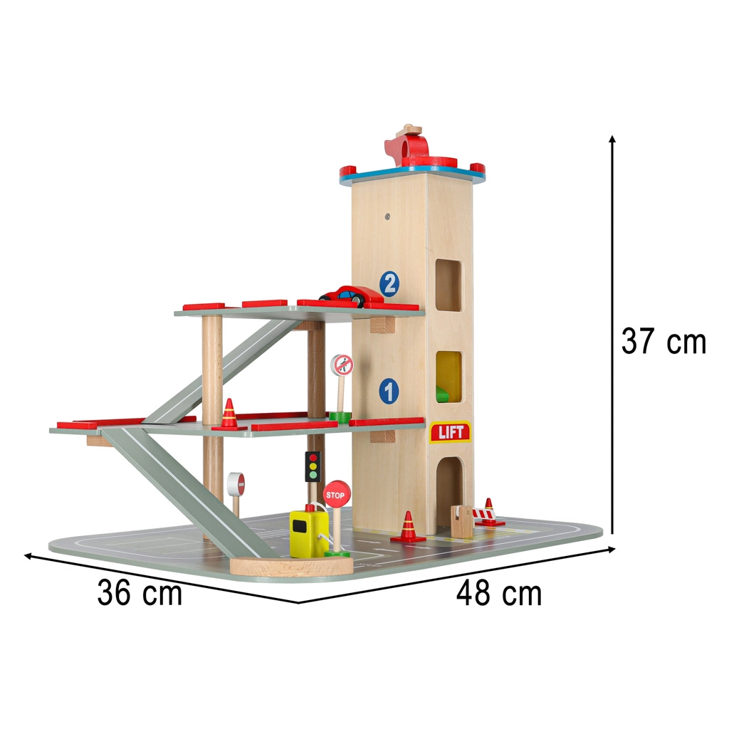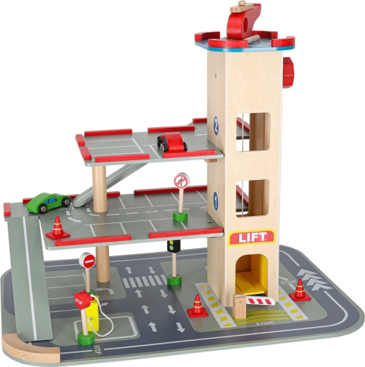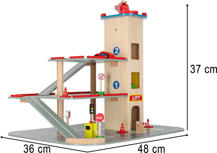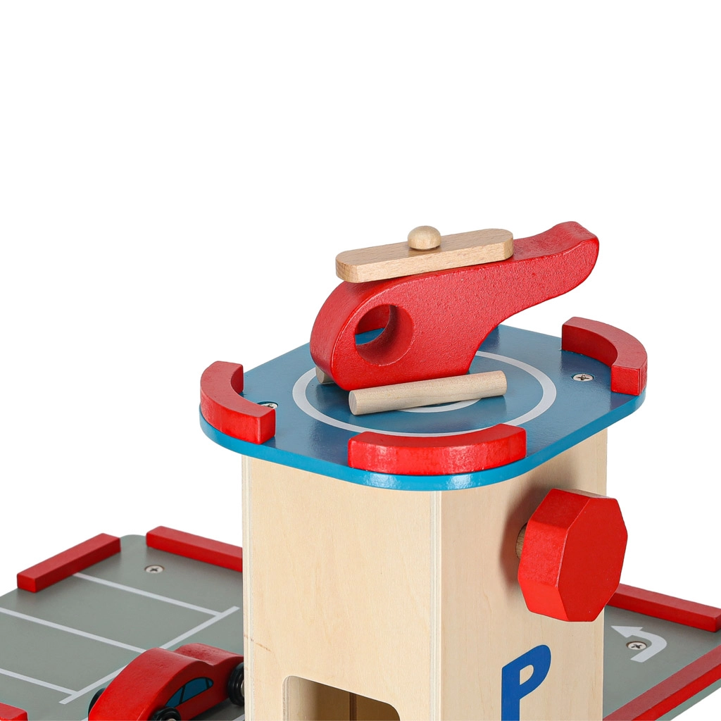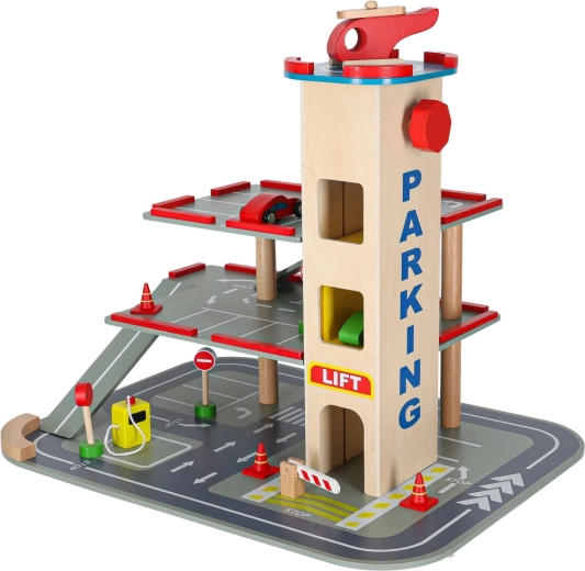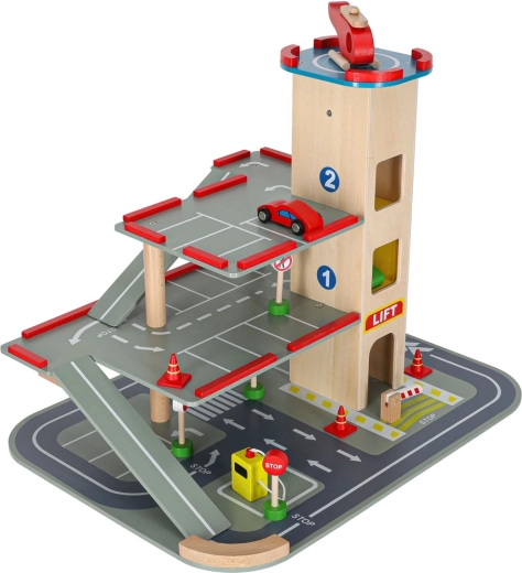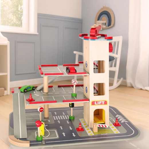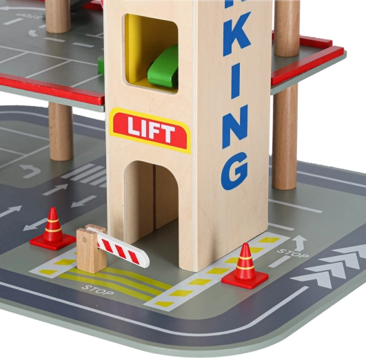 Táto kvalitná drevená garáž ponúka až 4 úrovne zábavy: tri poschodia na parkovanie a strešný heliport. Vďaka ručne ovládanému výťahu deti ľahko presunú autíčka medzi poschodiami a môžu využívať aj plynulé rampy. Set je ideálny na rozvoj jemnej motoriky, fantázie a učenie sa pravidlám cestnej premávky.