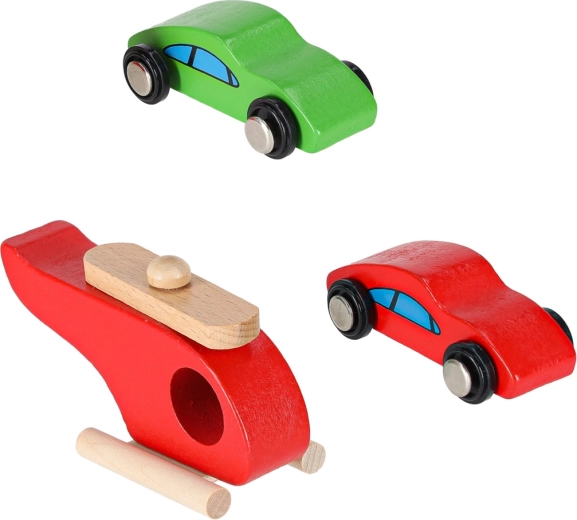 Súčasťou balenia je bohaté príslušenstvo: 2 drevené autíčka s voľne bežiacimi kolieskami, helikoptéra s rotujúcou vrtuľou, 4 dopravné značky, 3 kužele a palivový stojan. Všetky diely sú vyrobené z hladko brúseného dreva a lakované netoxickými farbami pre bezpečnú hru.