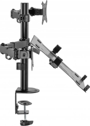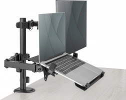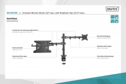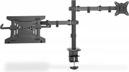 Držiak umožňuje individuálnu, priestorovo úspornú a ergonomickú montáž monitora s uhlopriečkou až 32''/9 kg a notebooku s uhlopriečkou až 15,6''/4 kg. Držiak VESA podporuje: Držiak ponúka dve možnosti montáže: stolová svorka aj priechodka sú súčasťou balenia. Vďaka rýchloupínaciemu uzáveru možno dosku VESA pri montáži/demontáži pripevniť alebo odpojiť pomocou skrutky. Vďaka integrovanému vedeníu káblov je na pracovisku poriadok.