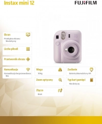 FUJIFILM Instax Mini 12 je skvelá voľba pre všetkých, ktorí chcú mať svoje spomienky hneď v ruke. Vďaka jednoduchému ovládaniu a spoľahlivej instantnej tlači je ideálny pre začiatočníkov aj kreatívnych nadšencov. Štýlové pastelové prevedenie vo fialovej farbe podčiarkne váš osobitý štýl.