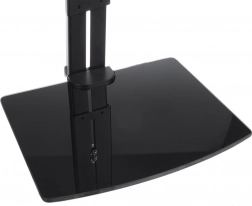 Integrovaná sklenená polica pojme Blu‑ray prehrávač, set‑top box, hernú konzolu či tablet a pomáha udržať kabeláž aj príslušenstvo prehľadne na jednom mieste.