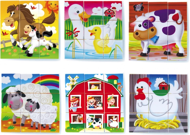 Objavte čaro farmy s ľahkými plastovými kockami, ktoré sú ľahko uchopiteľné aj pre malé detské rúčky. Každá strana kocky tvorí iný obrázok, takže deti môžu skladať 6 rôznych motívov a učiť sa rozpoznávať tvary, farby aj súvislosti.