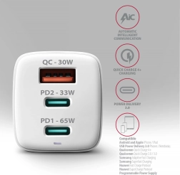 Kompaktná sieťová nabíjačka AXAGON GaN 65W rýchlo dobije až tri zariadenia naraz. Vďaka technológii GaN, dvom portom USB‑C PD 3.0/QC 4+ a jednému USB‑A QC 3.0 zvládne efektívne napájať notebooky, telefóny aj tablety maximálnou rýchlosťou. Podporuje PPS, Apple PD 20/27W aj Samsung SFC/SFC 2.0 a ponúka pokročilú viacstupňovú ochranu.