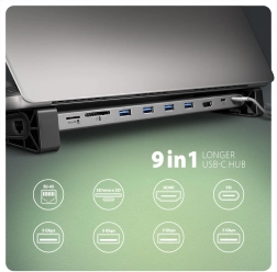 AXAGON HMC-10HLS LONGER prináša univerzálne dokovacie riešenie 9v1 pre moderné zariadenia s USB-C. Pripojte monitor v rozlíšení až 4K/60 Hz, štyri USB periférie, káblovú sieť cez GLAN a využite čítačku SD/microSD na rýchly prenos dát. Port USB-C PD 100 W napája a nabíja notebook, takže neprídete o žiadny port.