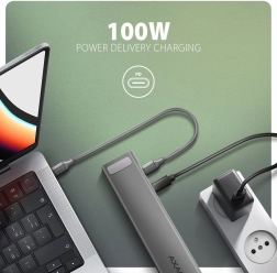 - Napájanie PD 100 W – nabíjanie notebooku cez hub