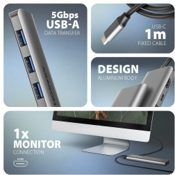 Hliníkové šasi zvyšuje odolnosť a napomáha chladeniu. Hub podporuje Plug & Play, Hot Plug aj pripojenie k telefónom s USB‑C. Ľahko pripojíte flash disk, klávesnicu, myš, externé disky alebo monitor/TV/projektor.