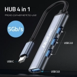 Vďaka USB 3.0 portu dosiahnete prenosové rýchlosti až 5 Gb/s – ideálne pre externé disky a rýchle kopírovanie súborov. Zvyšné 3× USB 2.0 spoľahlivo obslúžia periférie a príslušenstvo. Plug & Play zaisťuje okamžité použitie bez ovládačov na notebookoch, počítačoch, tabletoch aj telefónoch s USB‑C alebo Thunderbolt 3 s podporou dát.