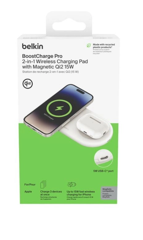 Užite si pohodlie skutočne univerzálneho nabíjania. Belkin BoostCharge Pro 2v1 prináša bezdrôtové nabíjanie Qi2 15 W pre iPhone 12 a novšie s magnetickým zarovnaním, ktoré telefón automaticky prichytí do ideálnej pozície. Druhá plocha poskytne 5 W pre AirPods a prehľadné LED diódy vás informujú o priebehu.