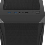 - Bohatá konektivita na hornom paneli: 2× USB 3.0, 1× USB 2.0, HD Audio, tlačidlá Power/Reset