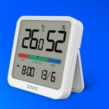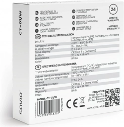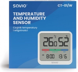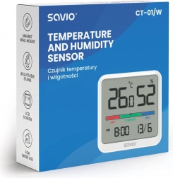 SAVIO CT-01 je všestranný izbový teplomer a vlhkomer, ktorý zobrazuje aktuálnu teplotu (°C/°F), relatívnu vlhkosť a komfortnú zónu pre rýchle vyhodnotenie vnútorného prostredia. Veľký, dobre čitateľný LCD displej dopĺňa čas a dátum, takže máte všetky dôležité informácie na jednom mieste.