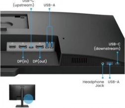 Monitor je navrhnutý na dlhé pracovné nasadenie. Ergonomický stojan podporuje náklon -5° až 15°, otočenie ±20° a pivot o 90° pre „na výšku“. Bohatá konektivita zahŕňa USB‑C, HDMI, DisplayPort (in/out) na jednoduché zapojenie viacerých obrazoviek, USB‑A hub na periférie a slúchadlový výstup.