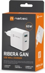 Natec Ribera GaN je vybavená dvoma portami USB (typ A a USB-C) s celkovým výkonom 65 W. Podporuje technológie rýchleho nabíjania ako Power Delivery 3.0, Quick Charge 3.0 a ďalšie, čo umožňuje rýchlejšie nabíjanie. Vďaka protokolu PPS sa automaticky prispôsobuje pripojenému zariadeniu pre efektívne nabíjanie.