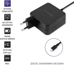 Sieťovú nabíjačku od Qoltec s výkonom 90 W. Má vstavaný kábel s konektorom USB typu C.
