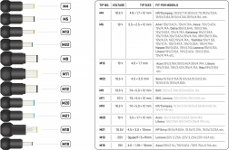 Obsahuje tipy M4 až M19 s detailnými špecifikáciami ako napätie a kompatibilné modely notebookov.