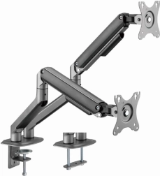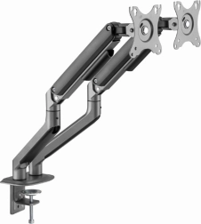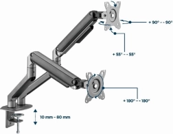 Zvýšte komfort a produktivitu s týmto stolovým držiakom na 2 monitory pre uhlopriečky 17–32". Ponúka plynulé polohovanie vďaka plynovým pružinám, otáčanie, náklon aj pivot do portrétu, pevné uchytenie svorkou alebo priechodkou a správu káblov pre čisté pracovisko. Nosnosť na monitor až 9 kg, kompatibilný so štandardom VESA 75 × 75 a 100 × 100.