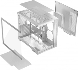 Štýlová biela skrinka s tvrdeným sklom na boku aj čele, dvojkomorovou konštrukciou a podporou dosiek s obrátenými konektormi. Ponúka USB‑C, priestor pre radiátory 360 mm, grafické karty až 400 mm a chladič CPU 175 mm. Súčasťou je ARGB radič až pre 9 ventilátorov; skrinka je bez predinštalovaných ventilátorov pre vlastnú konfiguráciu prúdenia vzduchu.